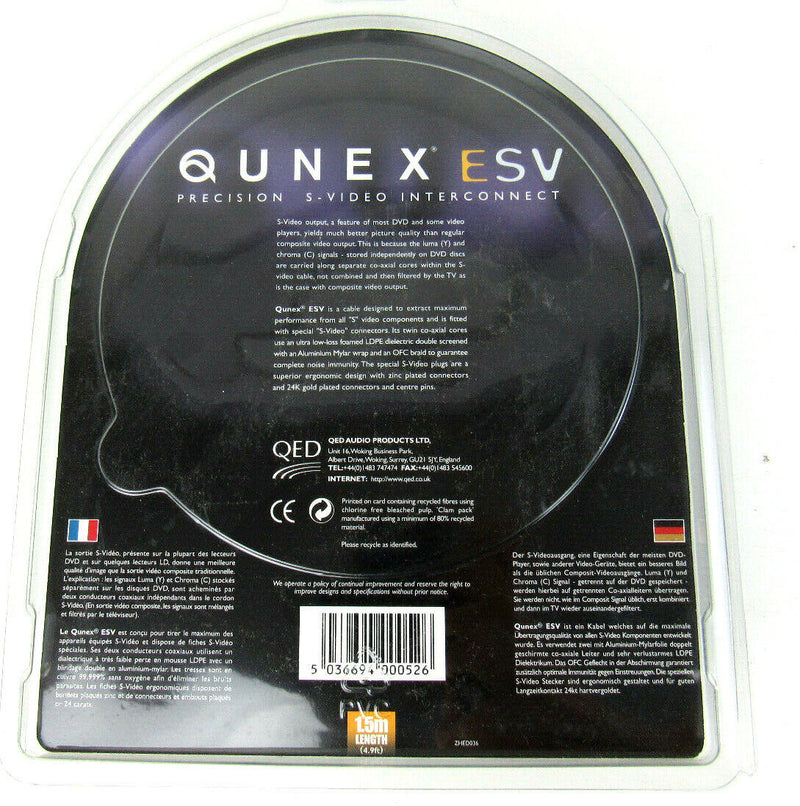 QED QUNEX ESV SVHS LEAD 1.5 meter QUNEX ESV is a s-video cable designed to extract maximum performance and is fitted with special 'S-Video' connectors. Oxygen Free Copper conductors in a co-axial geometry are clad with a low loss foamed LDPE dielectric and individually double screened to ensure signal integrity and noise rejection are of the highest order. With S Video the luma (Y) and chroma (C) components are separated and independently transmitted.QUNEX ESV is a high performance cable and a natural choice for all quality Home Theatre applications